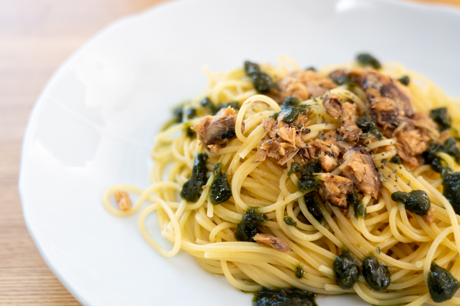 和風ペペロンチーノ風サバパスタは、醤油とオリーブオイルの香りがサバの旨味を引き立てるおすすめメニューです。